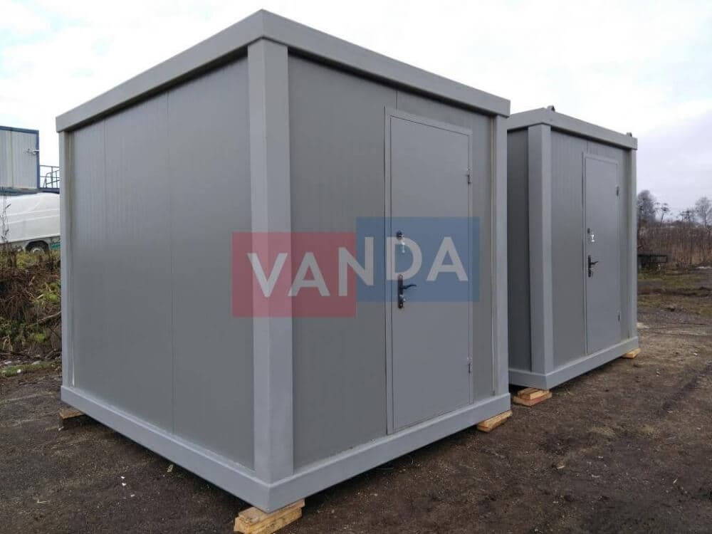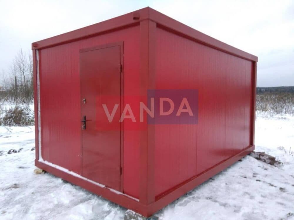 Данный контейнер не требует обустройства тяжеловесного фундамента, поскольку постройка легкая и устойчивая. Данный блок-контейнер может быть выполнен абсолютно любого размера и формы по эскизу заказчика.Контейнер состоит из металлического сварного основания. Стены изготовлены из сэндвич-панелей с прокладкой утеплителя. Крыша покрыта крашенным холоднокатаным металлом 1,2 мм. Помещение обустроено пароизоляцией при помощи технической пленки, которая проложена на полу и потолке. Внутренняя облицовка потолка выполнена из ПВХ-панелей, пол – из шпунтованной доски. Вход в помещение оборудован запирающейся металлической дверью.